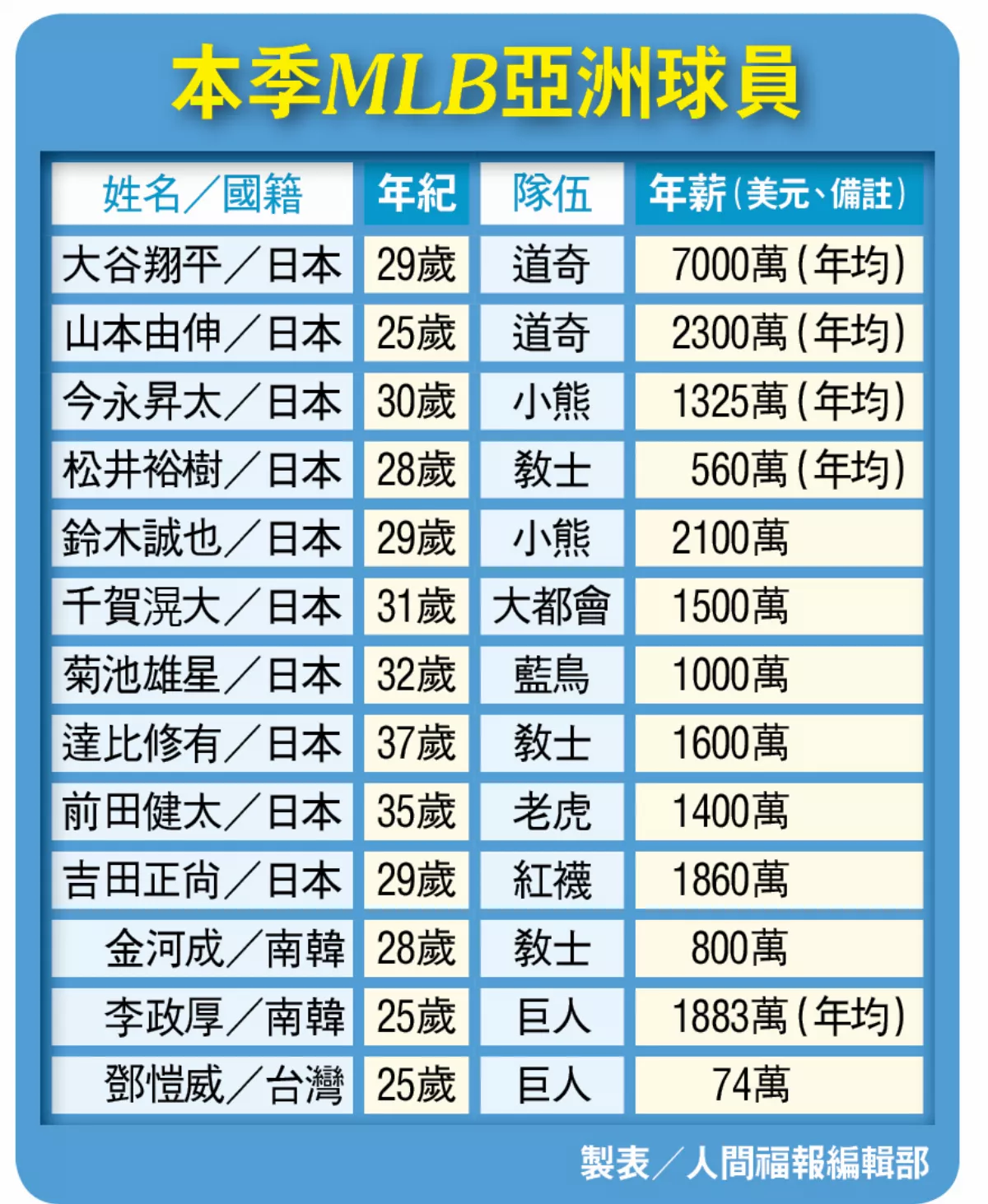 本季MLB亞洲球員名錄。製表/人間福報編輯部