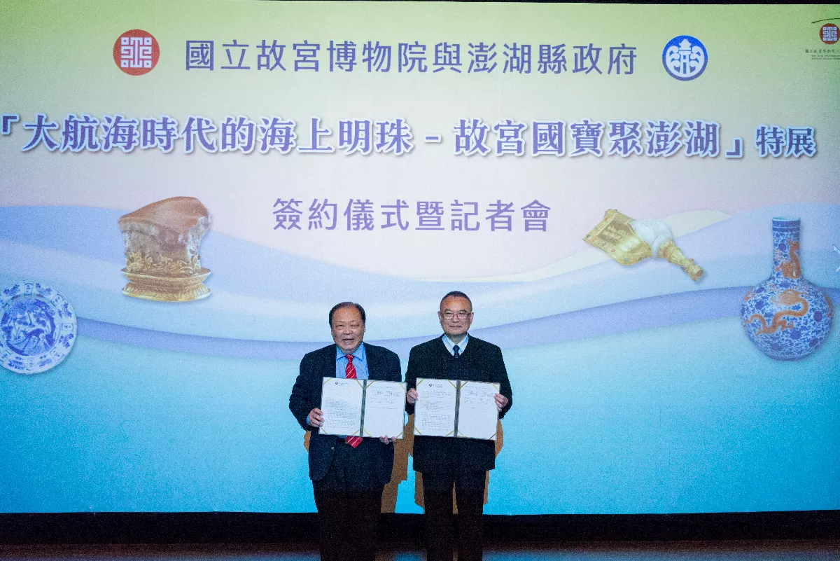故宮與澎湖縣政府締結「故宮國寶聚澎湖」展覽合作,由故宮院長蕭宗煌(右)、澎湖縣長陳光復(左)代表簽約。圖/故宮提供