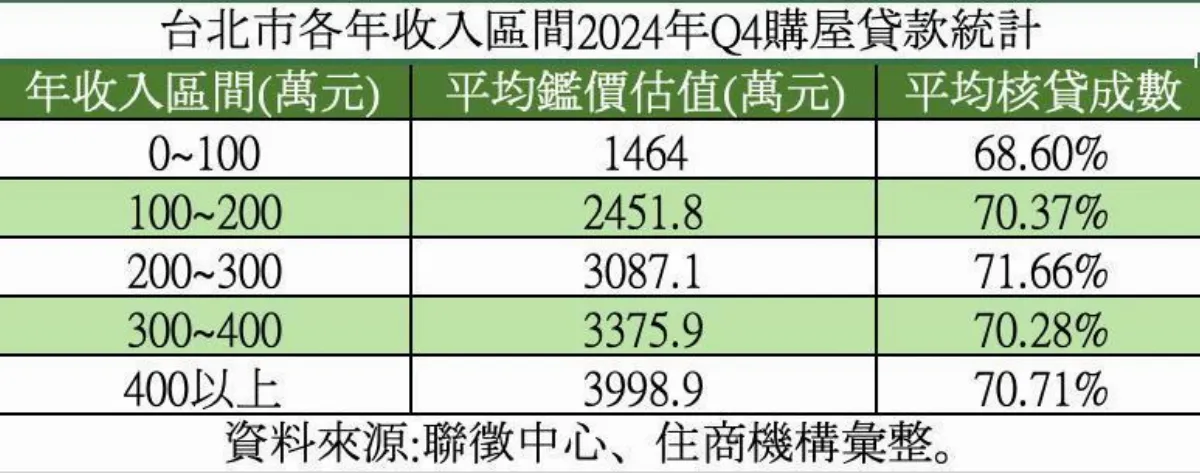 根據住商機構彙整聯徵中心資料,過去若為年收入100~200萬元區間的民眾,平均約在台北市購入總價約2,400餘萬元房產,而貸款成數約落在七成,貸款金額約1,680萬元,若以貸款年限30年、利率約2.6%計算,每月平均房貸壓力高達6.7萬元以上,確實家庭月收入至少得要10~20萬元以上,才不至於讓房貸壓力壓垮家庭收入。
