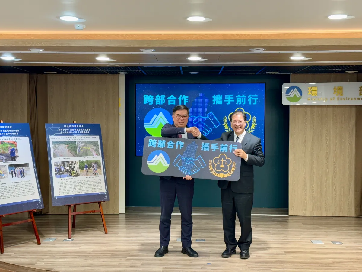 環境部長彭啓明(左)、法務部鄭銘謙跨部會合作,找出破壞環境的不法業者。圖/記者張穎容
