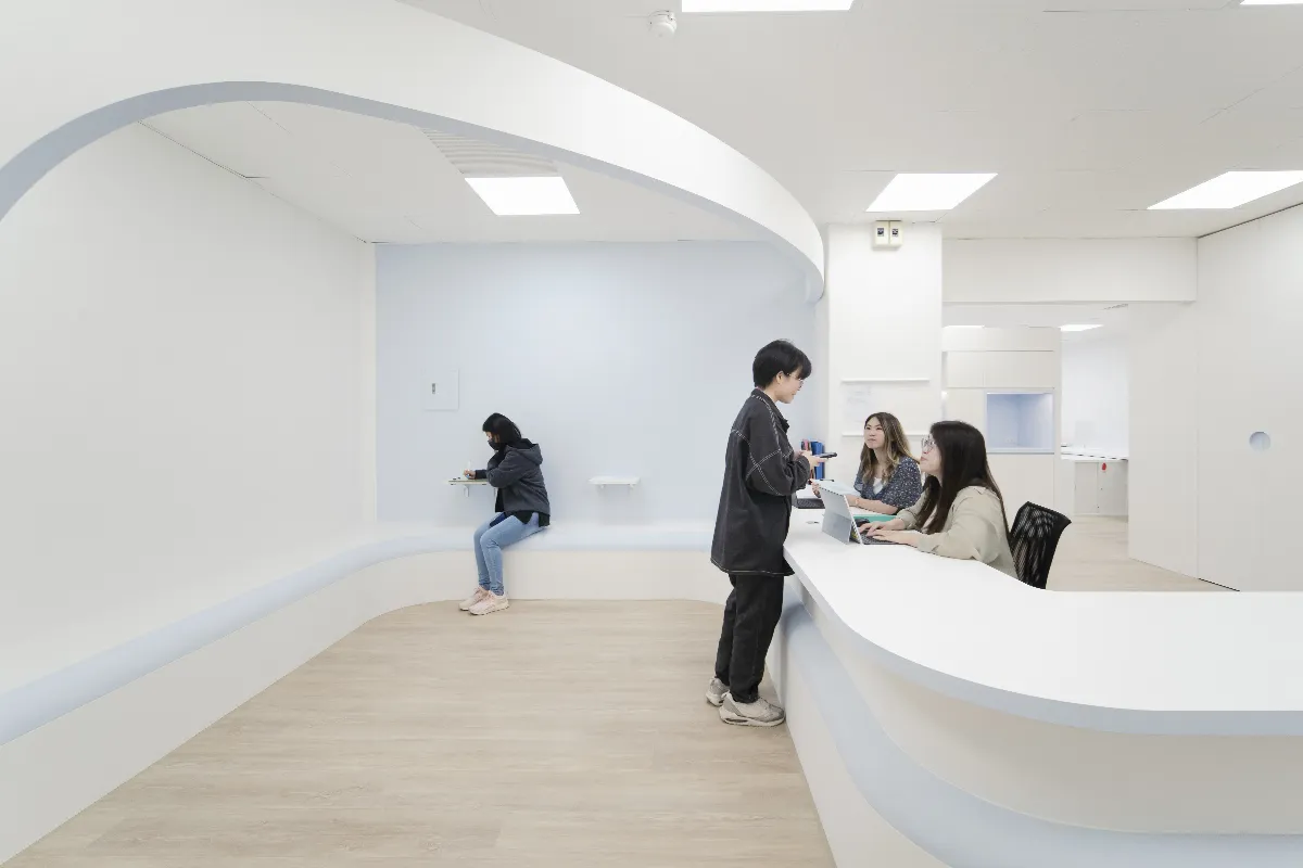 淡江大學由直感建築負責設計改造,設計團隊發現原有的諮商空間有歸納的問題,運用線條和色彩,打造出一個明確的視覺印象,以弧線創造出更多的流動空間,以溫柔的藍色和白色做對比,讓諮商空間更有溫暖的感受。