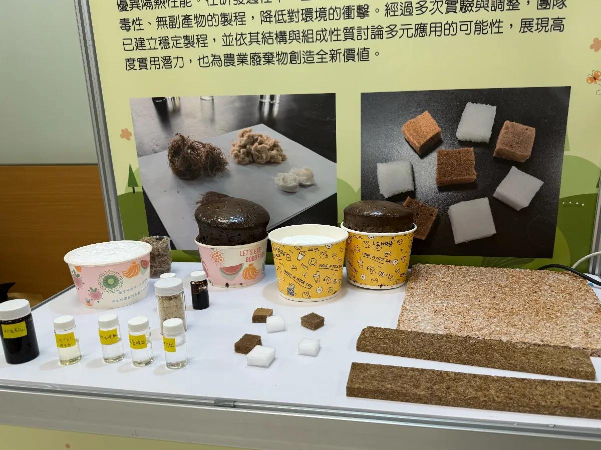 團隊完成的香蕉纖維製成的發泡材料(BPU)不僅隔熱效果佳,熱傳導係數僅為0.035~0.036 W/mK,相較傳統PU材料更具優勢,且質地柔軟,方便運輸及應用,還兼具防撞功能。