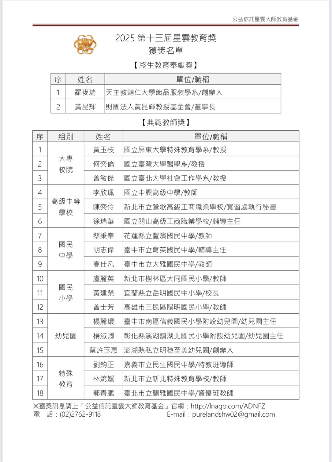 【記者曾博群綜合報導】由公益信託星雲大師教育基金主辦的「2025第十三屆星雲教育獎」獲獎名單日前揭曉,本屆共有20位來自各級學校與教育領域的傑出教育者脫穎而出,分別榮獲「終生教育奉獻獎」與「典範教師獎」,表彰他們在教育現場的深耕努力與創新實踐。