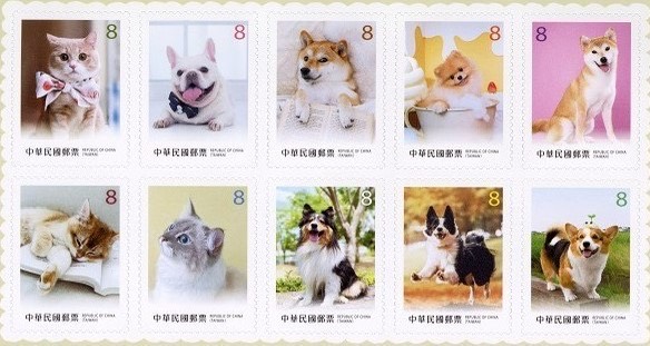 常用郵票可愛寵物預定9月9日發行,以去年舉辦「徵。郵你的!毛孩沙龍照」寵物郵票題材徵件活動10件獲獎最佳作品規畫發行郵票1套10枚,面值均為8元。為增添集郵樂趣與便利公眾用郵,本套郵票發行小全張1張及全張50枚自黏式郵票,郵票圖案分別為英國短毛貓、法國鬥牛犬、柴犬、博美犬、布偶貓、喜樂蒂牧羊犬、邊境牧羊犬及威爾斯柯基犬。