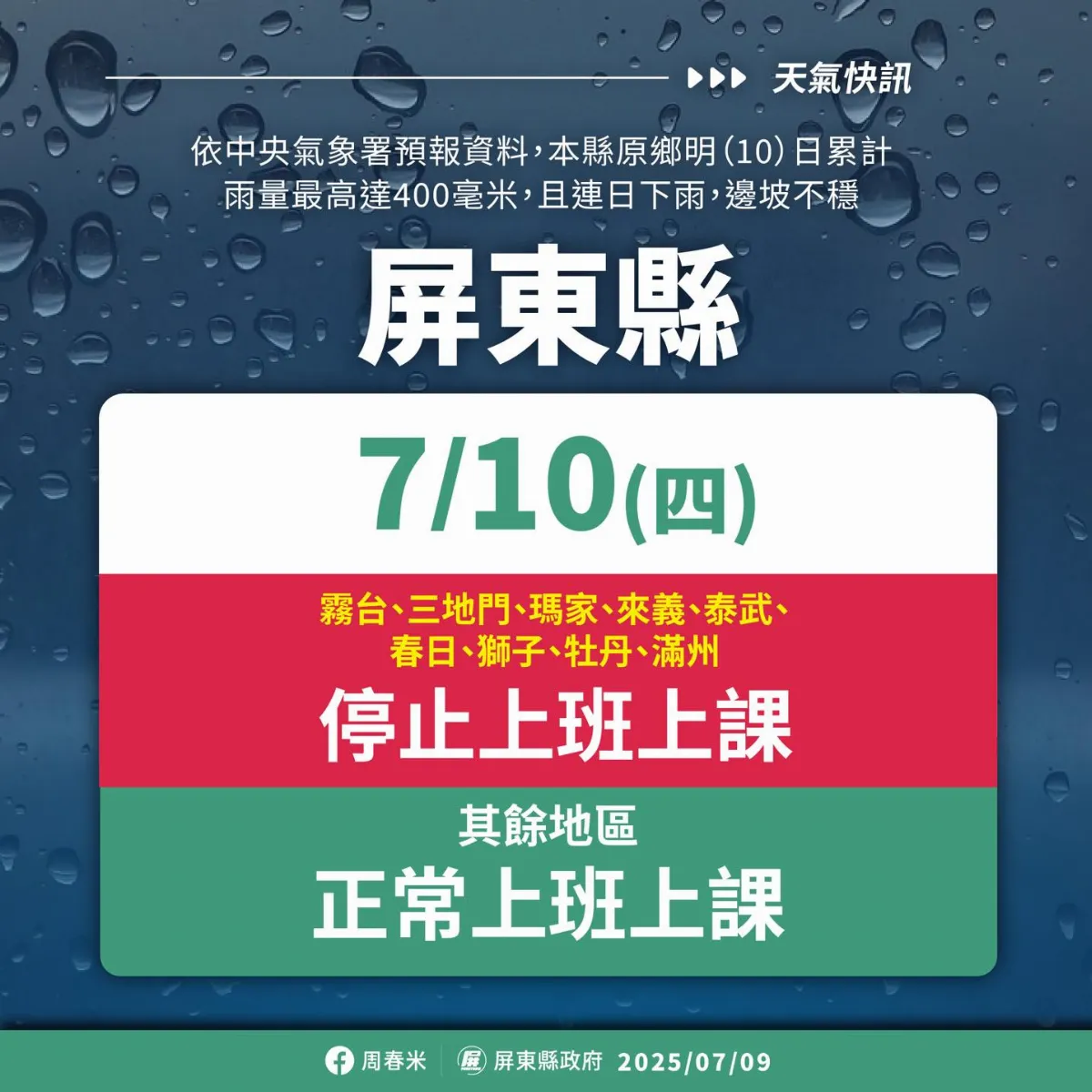 依中央氣象署預報資料,原鄉明10日累計雨量最高達400毫米,因此縣府決定包含霧台、三地門、瑪家、來義、泰武、春日、獅子、牡丹、滿州等9個鄉明日停止上班、停止上課。