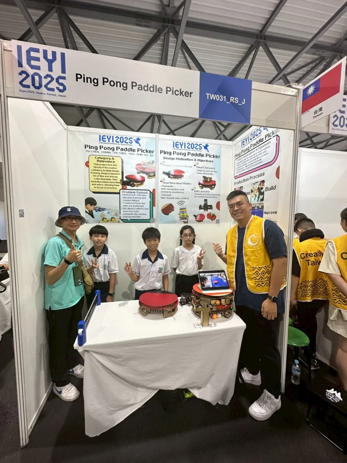 花蓮私立海星國小團隊發明桌球拍造型撿球機,團隊表示,桌球訓練常因頻繁撿球而耗費時間與體力,影響專注與效率。為解決此問題,研發桌球拍造型撿球機,結合收球、儲球與發球功能,讓練習更流暢。