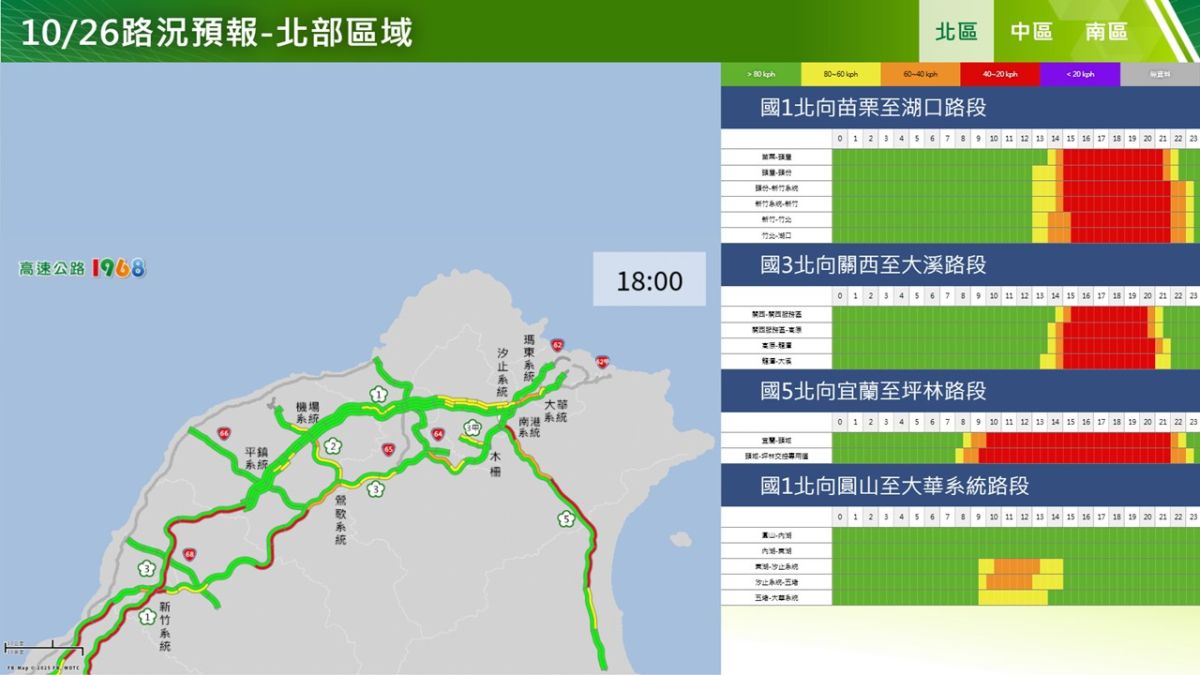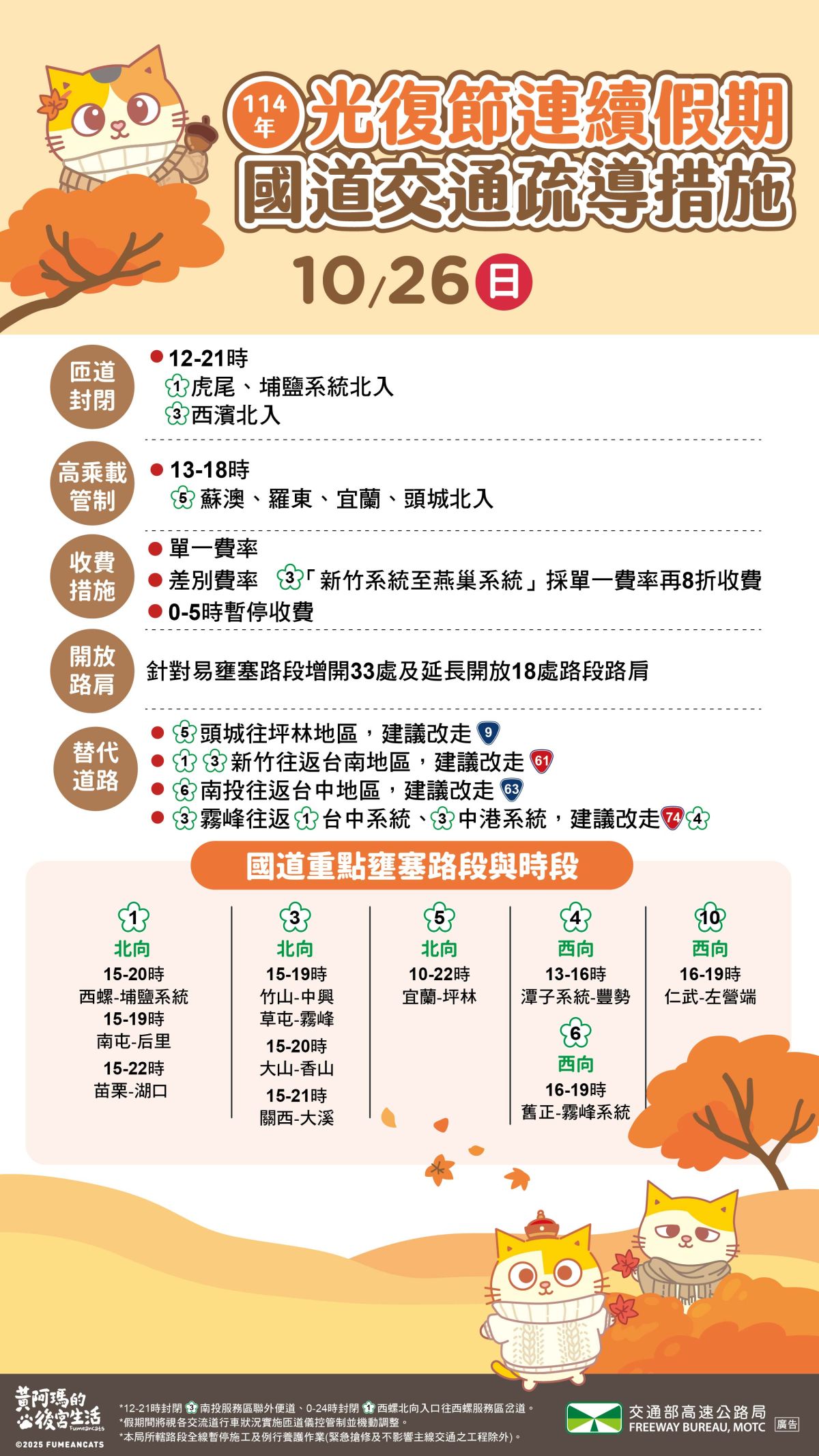 今日國道相關疏導措施包括12至21時封閉國1虎尾、埔鹽系統及國3西濱北向入口;13至18時國5蘇澳、羅東、宜蘭及頭城之北向入口高乘載管制;單一費率、差別費率、開放路肩、替代道路、匝道儀控等。