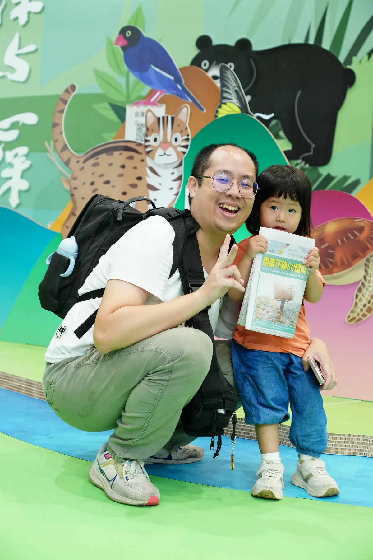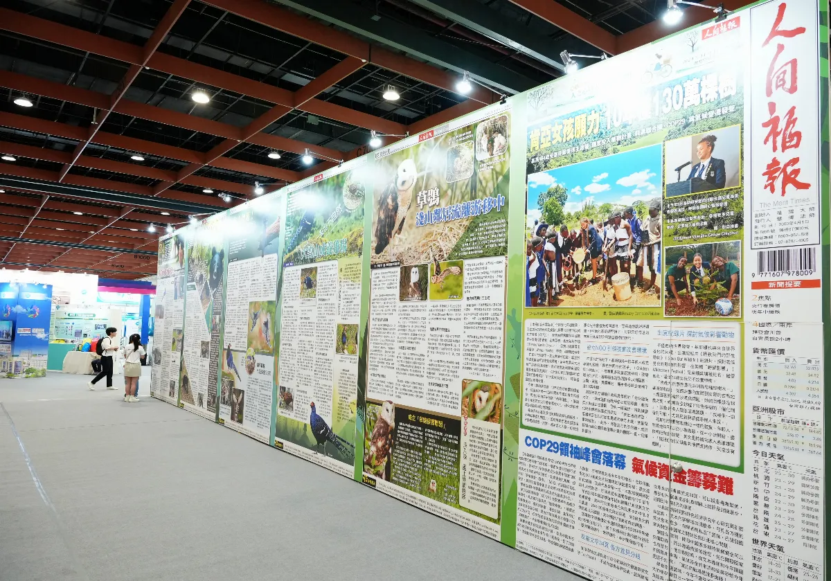《人間福報》展位的正前方是以樹木為造景,搭配分散各處的12項台灣特有動物,讓現場民眾可以拍照留念;展位後方設計則是將生態相關新聞輸出成背板,提供現場民眾閱讀省思。