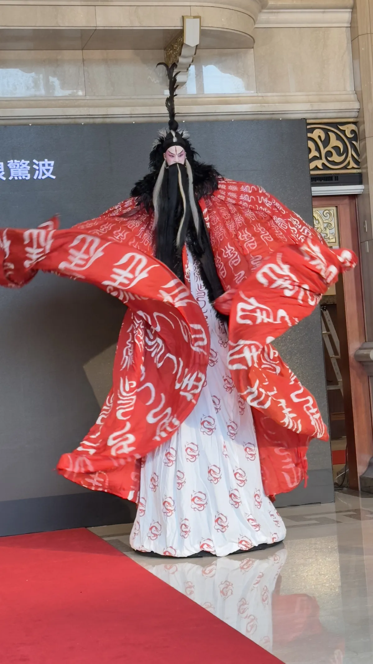 吳興國飾演的魔法師波布羅在記者會上,以約末三公尺高的氣勢亮相,驚豔全場。圖/記者曹麗蕙
