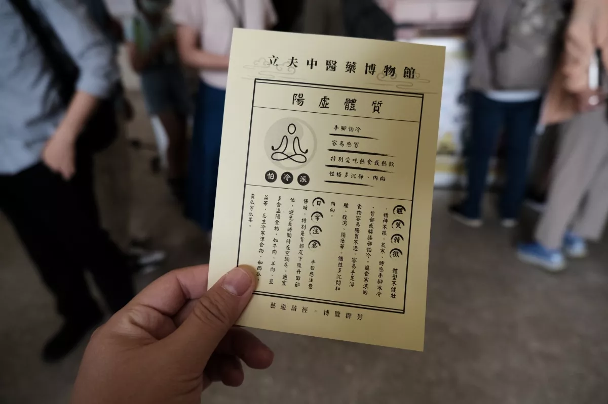 立夫博物館把檢測表做成翻牌遊戲,民眾可依翻牌後指示,在藥櫃版上找尋自己可能的中醫體質,最後得到一張中醫體質說明籤。這一套中醫體質簡易檢測,是以人工及AI的方式,找出問卷題目中對各種體質的關鍵問題,簡化至三到四層,亦即只需要回答幾題,就可以得知個人可能的中醫體質。