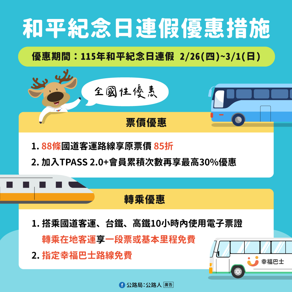 在公共運輸方面,公路局於2月26日至3月1日推出多項優惠措施,鼓勵民眾多加利用。連假期間搭乘西部中長途及東部國道客運路線可享票價85折優惠,加入TPASS 2.0會員者,當月搭乘達一定次數還可獲得回饋金,兩項優惠合併計算最高可享6折。