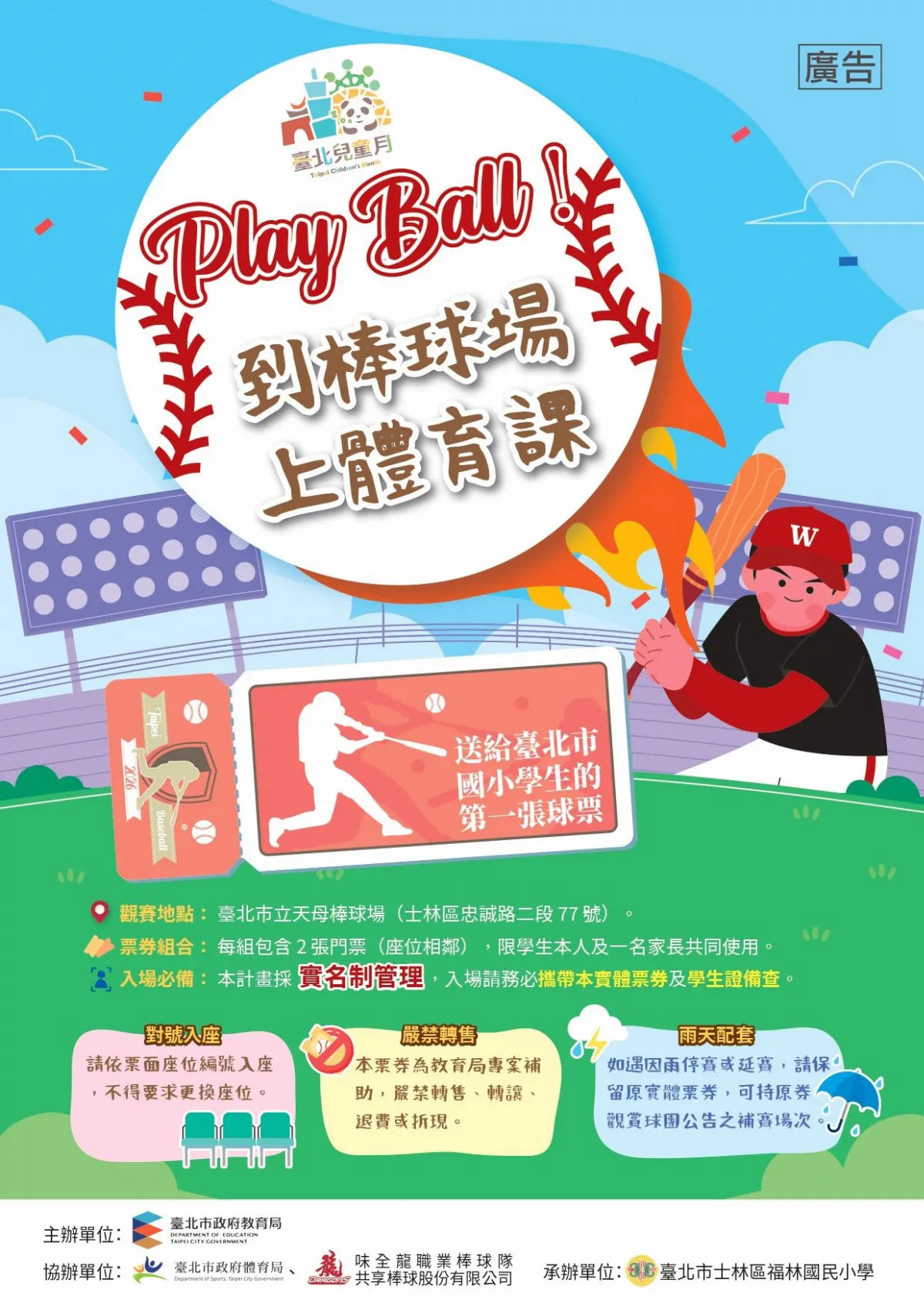 教育局表示,本次體育體驗券與味全龍球團公益合作共安排7場職業棒球賽事,包含4月3至7日的開幕系列戰,以及4月28、29日的例行賽,凡就讀台北市公私立國民小學之在學學生均可報名參與,本計畫採「1組2張」票券模式發放,確保每位錄取學生均可由1名家長陪同入場,讓觀賽成為親子共同參與的兒童節禮物。