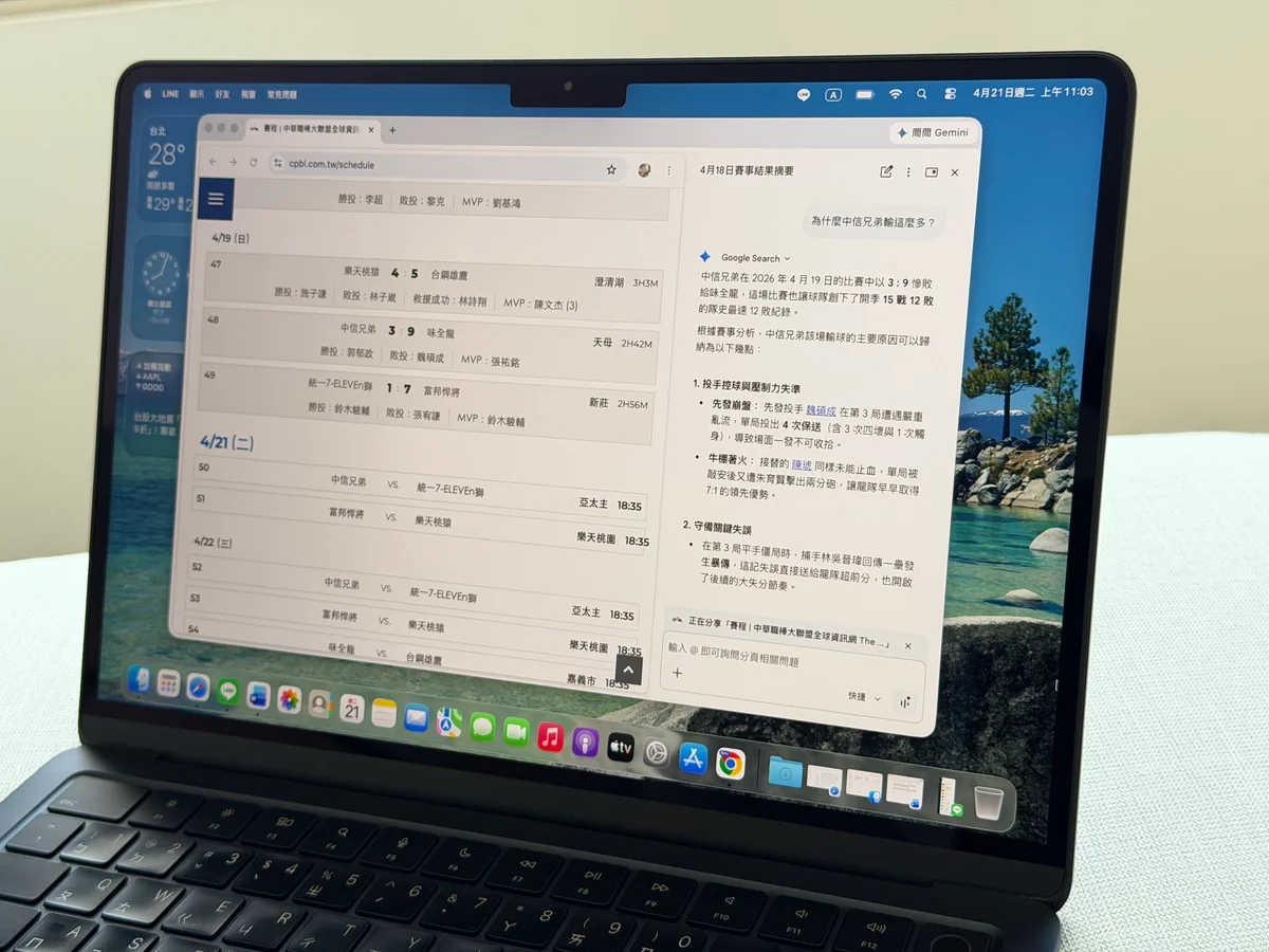 實測瀏覽中華職棒官網時,詢問Gemini有關4月19日的比賽結果,Gemini不僅能總結單一球隊開季以來的戰績,還可以分析4月19日輸球原因包括先發投手崩盤、牛棚著火、守備關鍵失誤等。如果想看週末球賽,Gemini甚至能啟動代理工作任務,幫忙查詢特定熱區的剩餘座位與票價,實用性相當高。