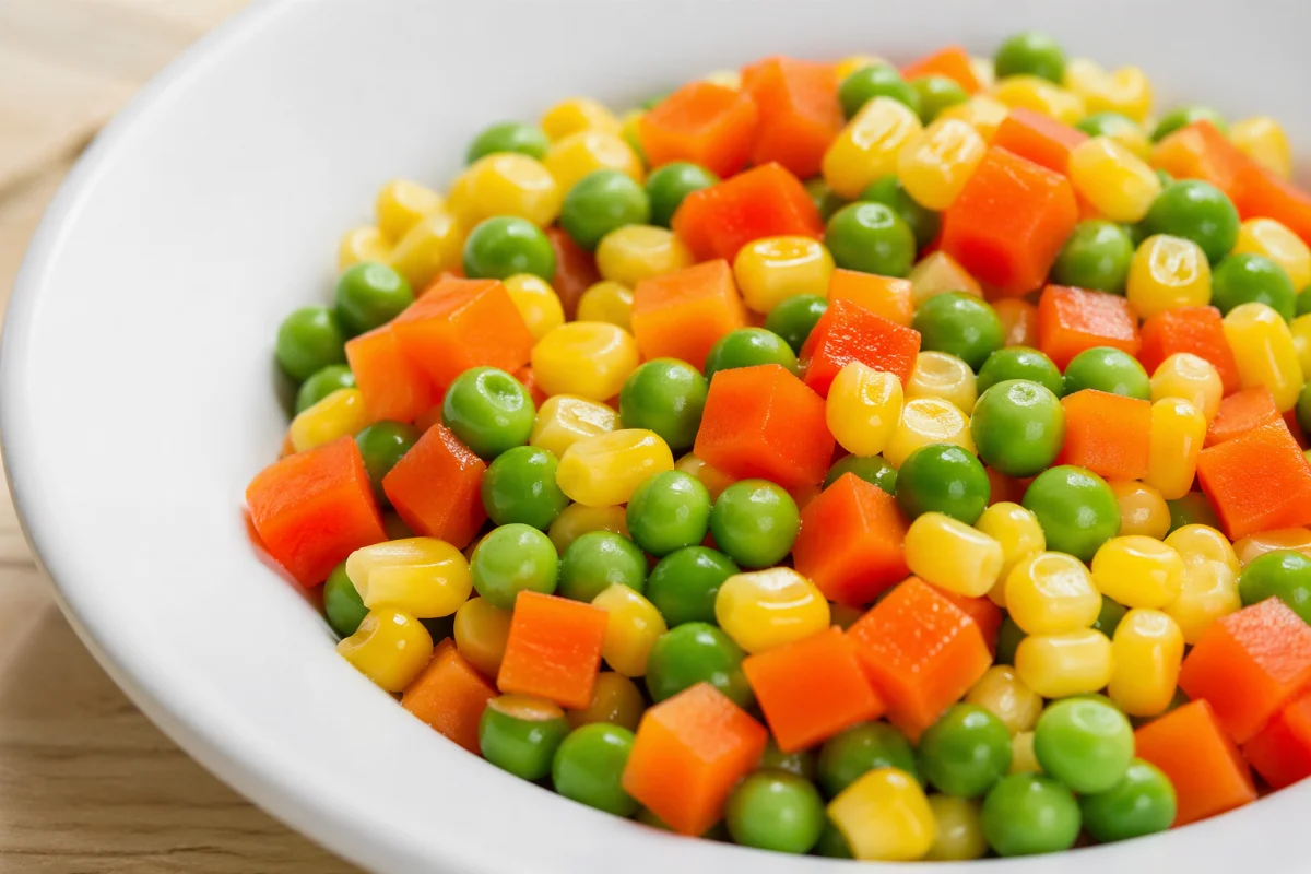 胡蘿蔔丁多採橘色品種,甜度較高、口感清脆,富含維生素A與β胡蘿蔔素;玉米粒以甜玉米品種為主,風味香甜,含葉黃素和玉米黃素;豌豆仁則選用嫩豆用品種,豆仁豐肥、翠綠鮮嫩,含澱粉及膳食纖維等營養。
