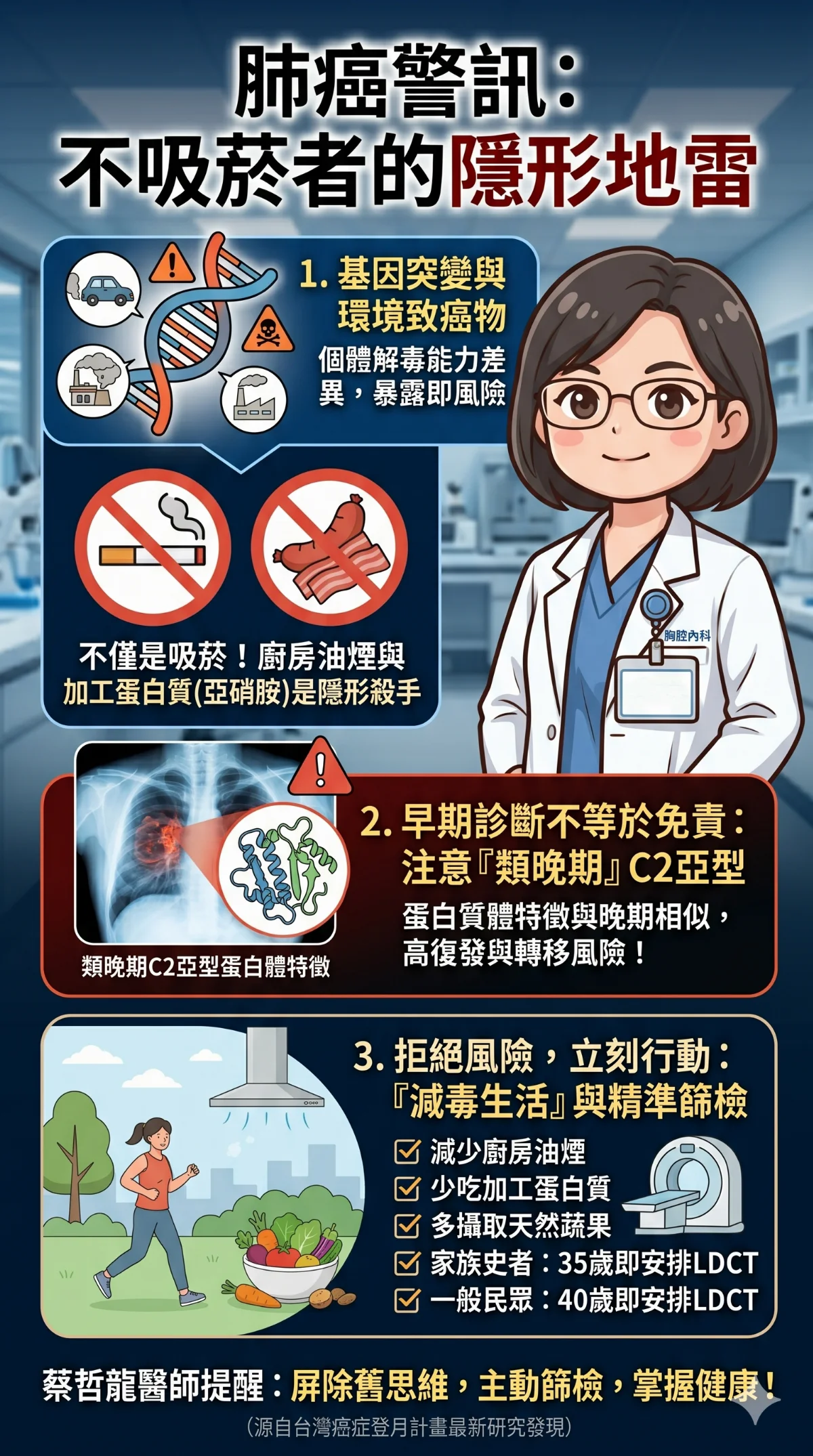 胸腔內科蔡哲龍醫師解釋,不抽菸卻罹肺癌是環境與基因交織的結果。研究鎖定三大關鍵因子: