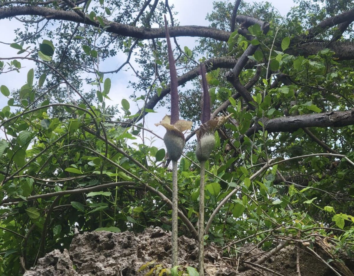 壽山自然公園管理處今(4/28)日表示,魔芋於每年約4至6月開花、6至8月結果,主要分布在壽山與半屏山,因鄰近步道,易受到人為干擾。管理處今年起委託中山大學生物科學系團隊執行「魔芋調查研究暨教育推廣計畫」,針對兩種魔芋的族群分布與棲地做調查,也探討魔芋的繁殖生物學特性與親緣關係,以釐清其繁殖受限的可能因素,以作為後續保育管理與復育的參考。