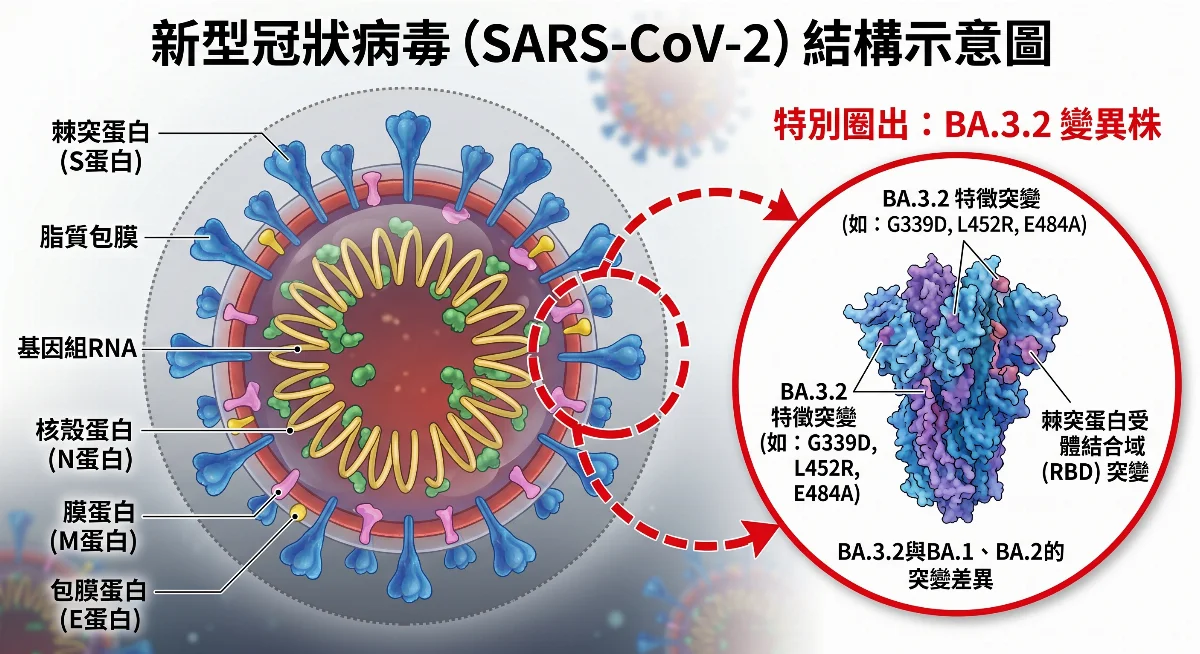 新冠病毒最新流行的變異株BA.3.2,已知可能導致免疫脫逃,增加傳播速率以及再感染風險,不排除與往年一樣可能在夏季五至七月爆發,無論是在大陸或是在全球,都被預估恐會有一波疫情。