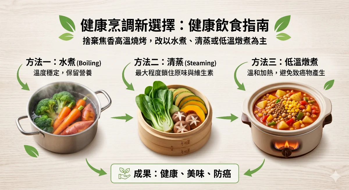 烹調方式轉型: 捨棄焦香的高溫燒烤,改以「水煮、清蒸或低溫燉煮」為主。這些烹調方式溫度穩定,能最大程度保留營養並避免致癌物質產生。