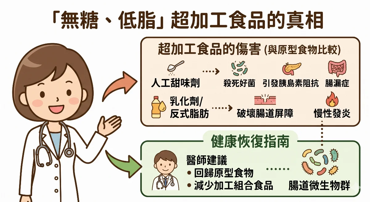 【記者張睿杰整理報導】現代精致飲食的浪潮下,多數人已建立「高糖、高油有害健康」的常識。許多標榜「健康、無負擔」的無糖或少油食品,背後其實隱藏更致命風險。家醫科醫師李思賢指出,這類「超加工食品」(Ultra-processed foods)對腸道微生物群的傷害,不僅會削弱代謝能力,更會引發全身性的連鎖反應,從情緒不穩到神經退化,無一倖免。