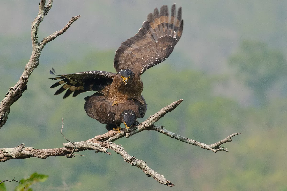 生態攝影師白欽源因為聽見鳥禽在山中的低鳴,驚喜發現正在交配的大冠鷲(蛇鵰),在短短3秒鐘的瞬間捕捉到永恆畫面。圖/中央社