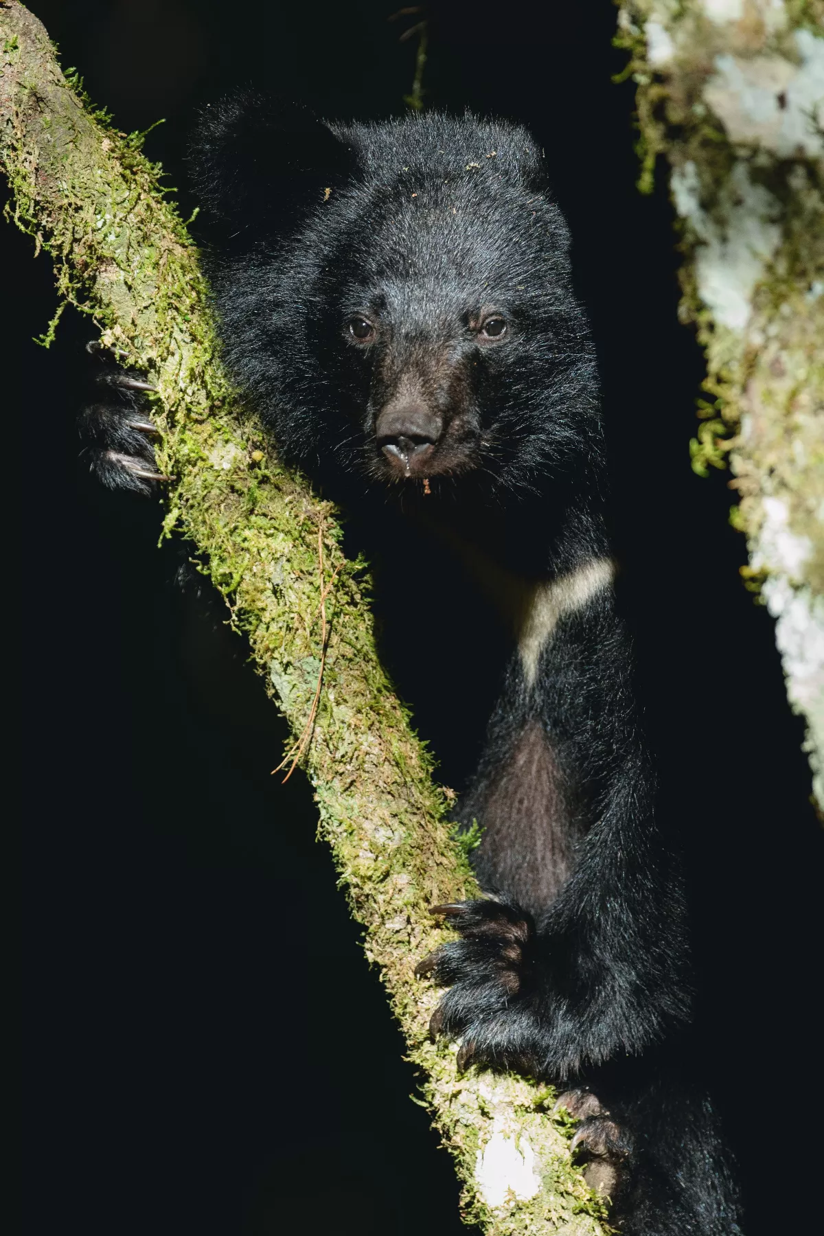 生態攝影師白欽源在山中偶遇台灣黑熊,拍攝到在樹上進食的小熊,隨著母熊叫喚而爬下樹的照片,小熊模樣十分討喜,臉上還掛著一條鼻涕。圖/中央社