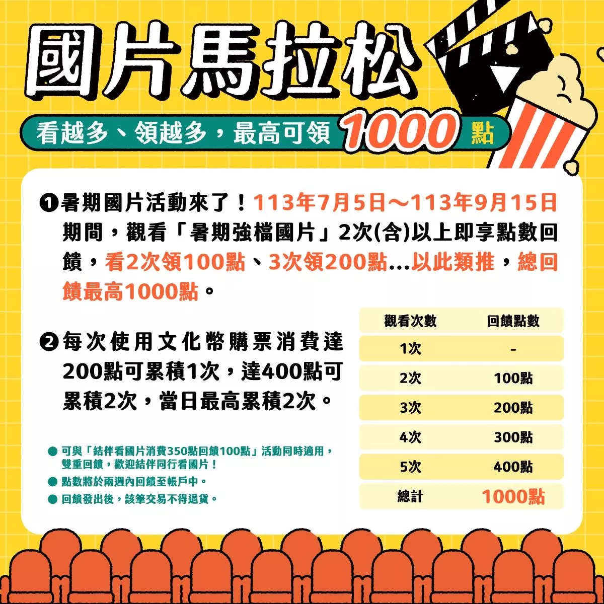 文化部表示,「國片馬拉松」只要消費達200點就視為累計看1次國片,同時,原有的「結伴看國片」消費350點回饋100點活動也持續進行。舉例而言,如果喜歡自己看國片,每次花200點,看第2次就可以獲得100點、第3次獲得200點、第4次300點、第5次400點,總共就為自己的文化幣帳戶增加1000點;如果喜歡揪好友一起看國片,單次使用400點文化幣,除了可以累積觀看次數2次,還會再加上「結伴看國片」活動再回饋100點。