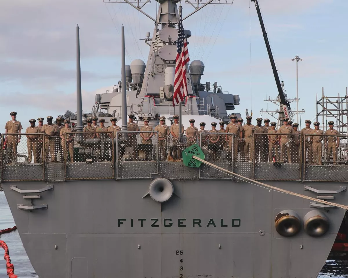 費茲傑羅號現正停靠在珍珠港,參與環太平洋演習(RIMPAC)。基地內29國的40艘軍艦8日起出海,準備進入演習第二階段的海上操演。