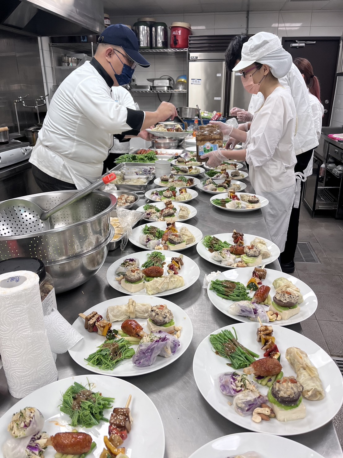 交流的過程中,義大師生還準備精緻美味的餐食,由學生規畫料理營養分配,說明每道菜色的營養組合,團隊不僅傳遞食材營養概念,也將廚藝和創意料理手法分享給法師。