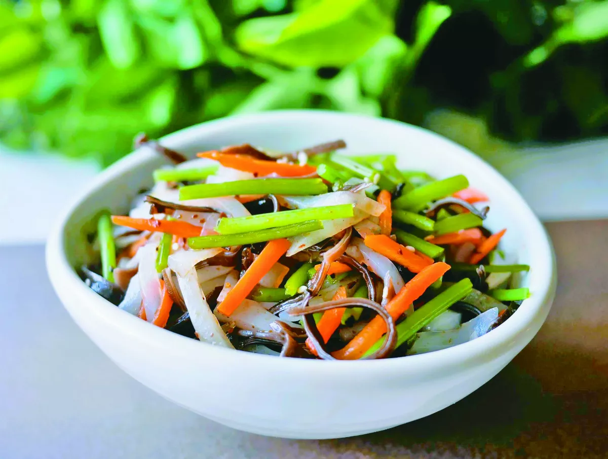 ❸以滾水分別汆燙木耳絲、蒟蒻絲、胡蘿蔔絲、番薯葉梗,撈出加入調味料拌勻即可上桌。