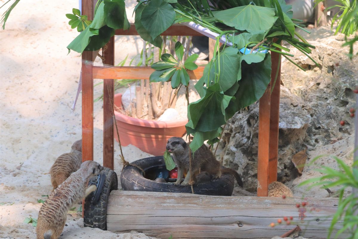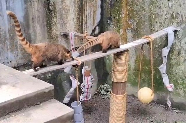 保育員為克服長鼻浣熊因分群而缺乏垂直的活動環境,設置「長鼻浣熊體能鍛鍊場」,增加3D立體運動空間;也為喜歡四處探索、挖掘沙地的狐獴設計一座「豪華搖搖輪圈扭蛋機」,另外運用廢棄輪胎置入可更換內容物的扭蛋,並在扭蛋中加入狐獴喜歡的食物,透過滾動和翻轉的扭蛋設計,很符合狐獴探索的習性,也延長取食時間,讓狐獴像是一群在扭蛋機前流連忘返的小朋友。